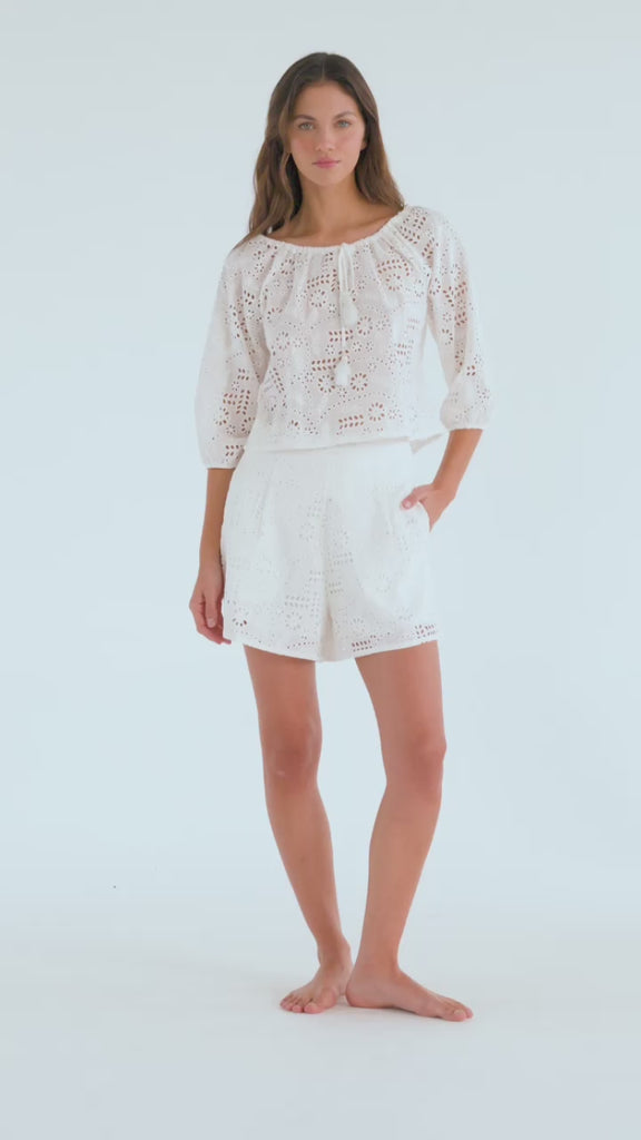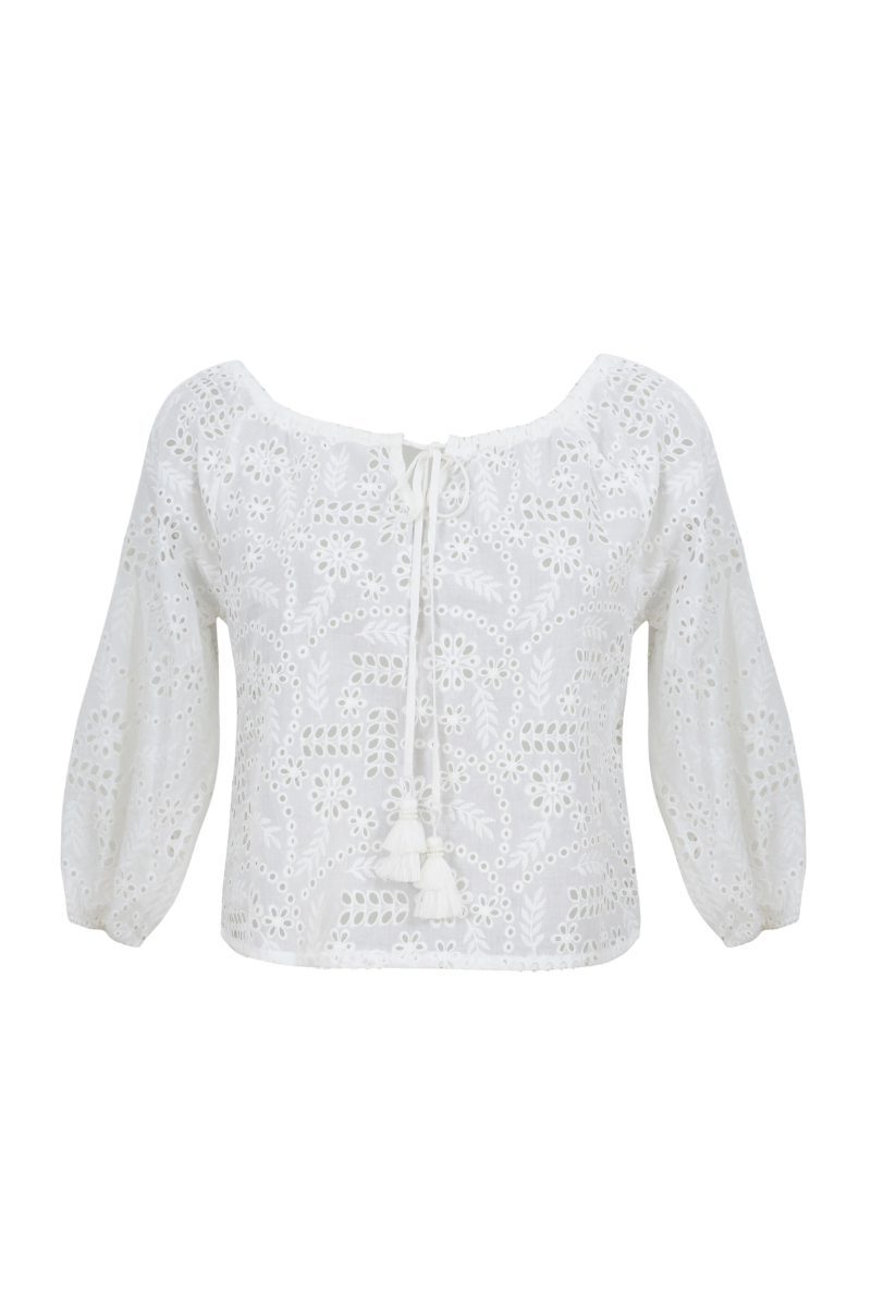 The Lori Shirt is a drawstring top with a 3/4 sleeve. It has decorative tassels on the strings. It's made with delicate and comfortable cotton eyelet. Made in Colombia. 100% Cotton