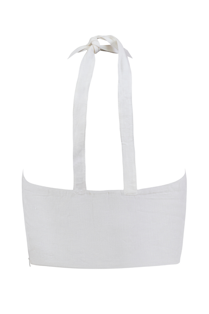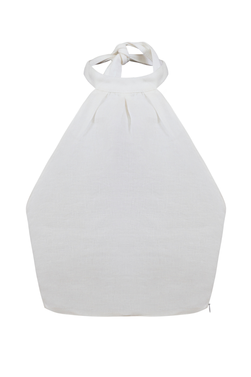 Our Abril Top is a linen halter high-neck top with a side zipper. It ties in the neck. Made in Colombia. 100% Linen