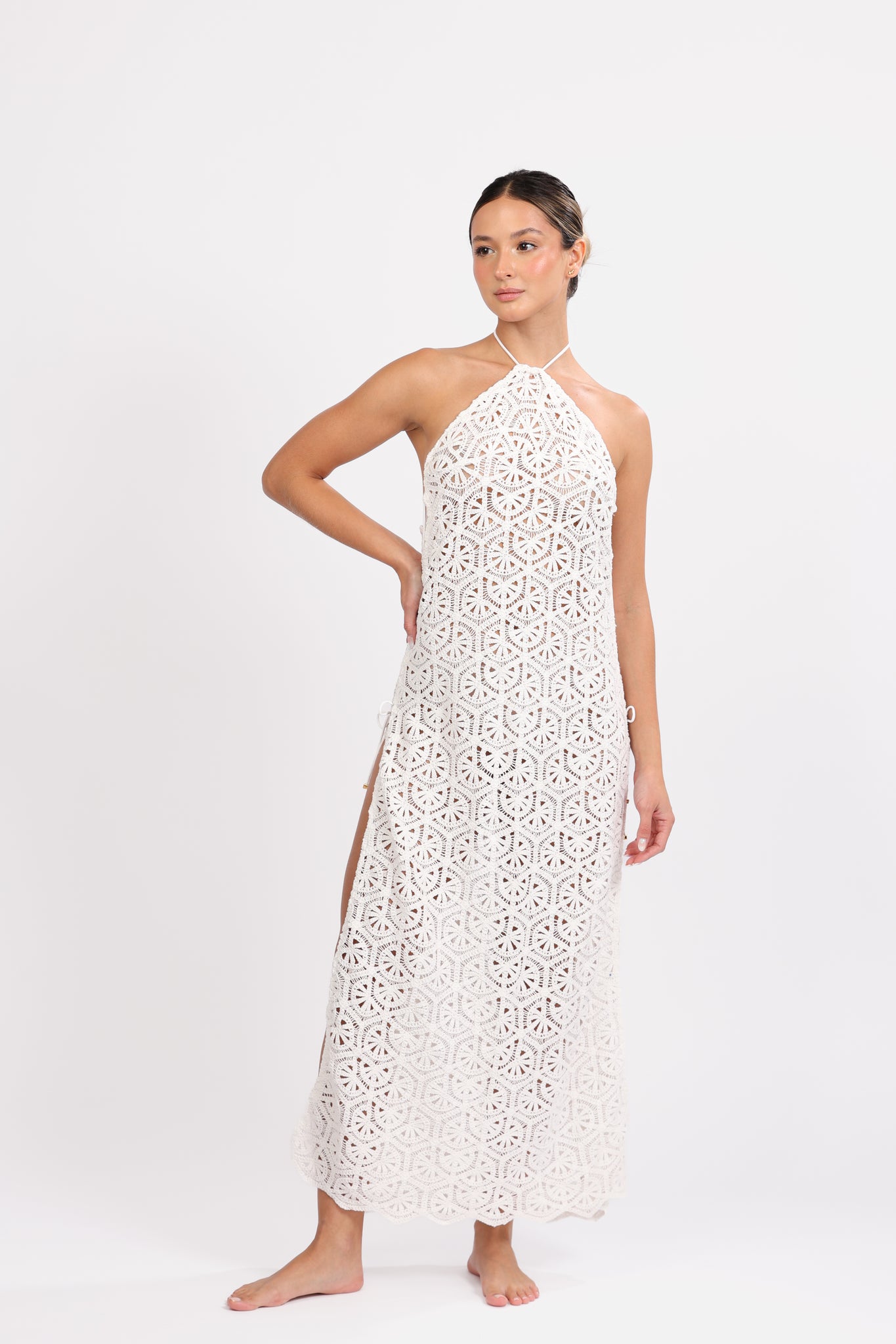 Long dress made with cotton crochet fabric. It's a halter neck and ties at the back, with open sides. Care instructions: Wash only by hand and cold water, be extra gentle while washing and use a delicate laundry soap. Rinse as soon as possible after your beach and pool dips. Do not use washer or dryer. Do not bleach nor wring dry. Made in Colombia. 100% Cotton