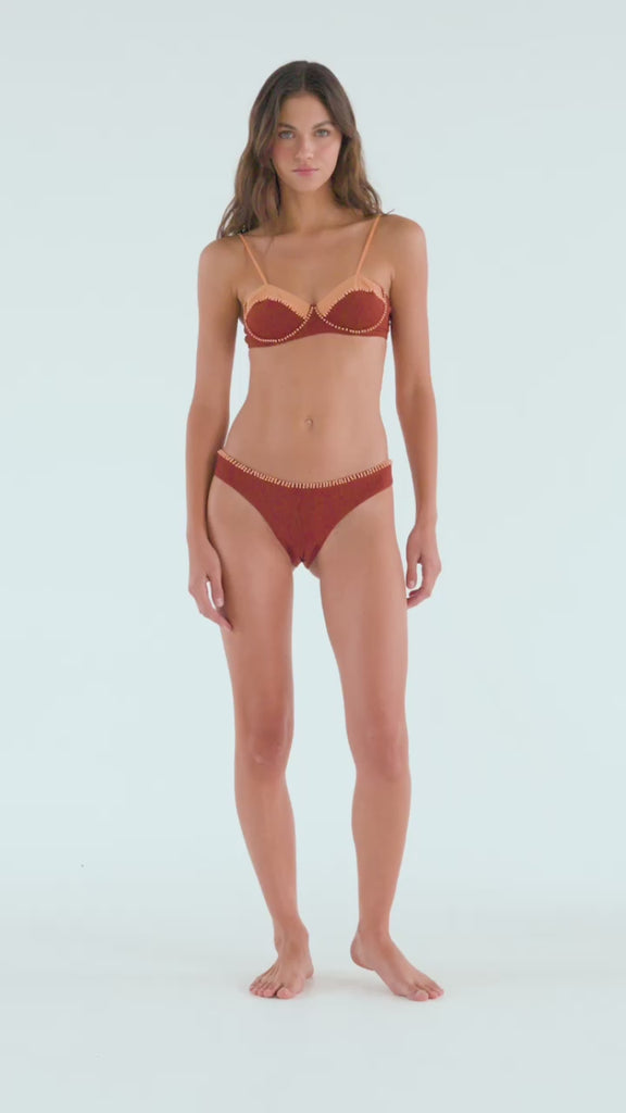 Our Aster Bottom is a classic moderate coverage bottom. The fabric is soft and elastic. It features a hand-made double-row embellishment at the waistline. Made in Colombia. 79% Polyamide 21% Elastane