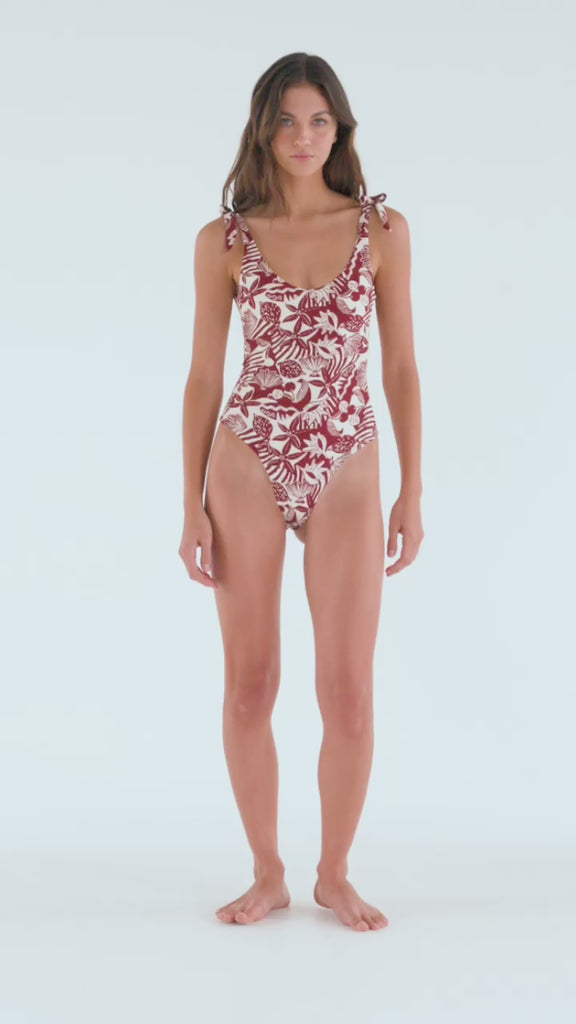 Our Irene One Piece is our classic cut one piece that has a subtle open back with ruching. It features delicate shoulder straps that can be tied to your liking. The fabric is soft and printed. It's the perfect combination of style and comfort. It has removable soft cups. The fabric is from Italy. Made in Colombia. 86% Polyamide 14% Elastane